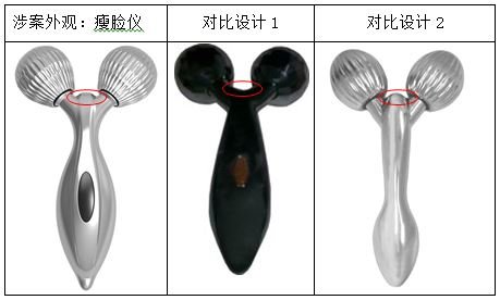 請求人主張,將證據(jù)1組合證據(jù)2的兩個按摩球中間的凸出部位,涉案專利與上述證據(jù)的組合相比不具有明顯區(qū)別。焦點問題在于,盡管證據(jù)2的兩個按摩球中間具有明顯可見的凸出部分,且形狀與證據(jù)1的按摩球中間外凸形狀一致,但是否可以作為設(shè)計特征與對比設(shè)計1進行組合。