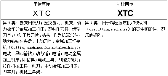 “XTC”商標(biāo)第01;06;07;09;11類馬德里指定新加坡申請被引證英國公司C&T MATRIX LIMITED名下的第7類在先商標(biāo)下發(fā)駁回,部分駁回了申請商標(biāo)在第7類商品上的申請注冊。申請商標(biāo)和引證商標(biāo)信息具體如下: