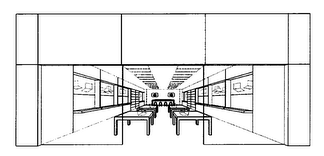 該商標申請所提交的商標描述為:商標由零售商店的設計和布局組成。該商店的特征是一個透明的鑲板外墻玻璃店面,由上方的大型矩形水平面板,兩個較窄的側面面板組成。在商店內,矩形的嵌入式照明裝置橫穿商店天花板的長度。沿著側壁在凹陷的展示空間下方有懸臂式貨架,在商店中間平行于墻壁,有并成一直線的矩形桌子,從商店的正面延伸到商店的背面。沿著側壁有多層擱板,在商店的后面有一個帶凳子的長方形桌子,下方放置視頻屏幕。墻壁、地板、照明設備和其他固定裝置以虛線顯示,不屬于商標的特征;但是,各種物品的放置被認為是整體標識的一部分。
