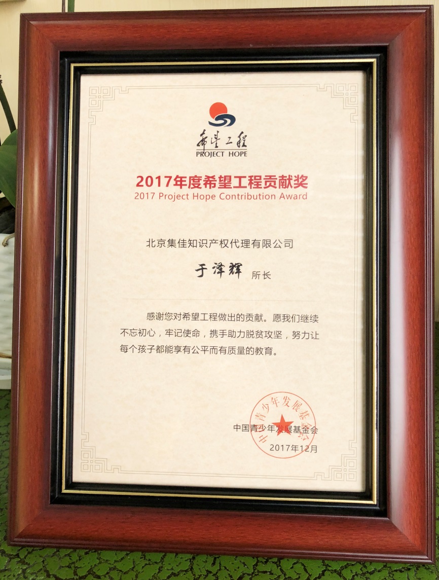 近日,集佳收到了中國青少年發(fā)展基金會頒發(fā)的“希望工程優(yōu)秀合作伙伴”獎與“2017年度希望工程貢獻(xiàn)獎”,特別表彰于澤輝所長帶領(lǐng)集佳對希望工程作出的支持與貢獻(xiàn)。此外,青基會在《中國青年報》刊發(fā)整版感謝函,對包括集佳在內(nèi)的100多家單位和企業(yè)衷心致謝。