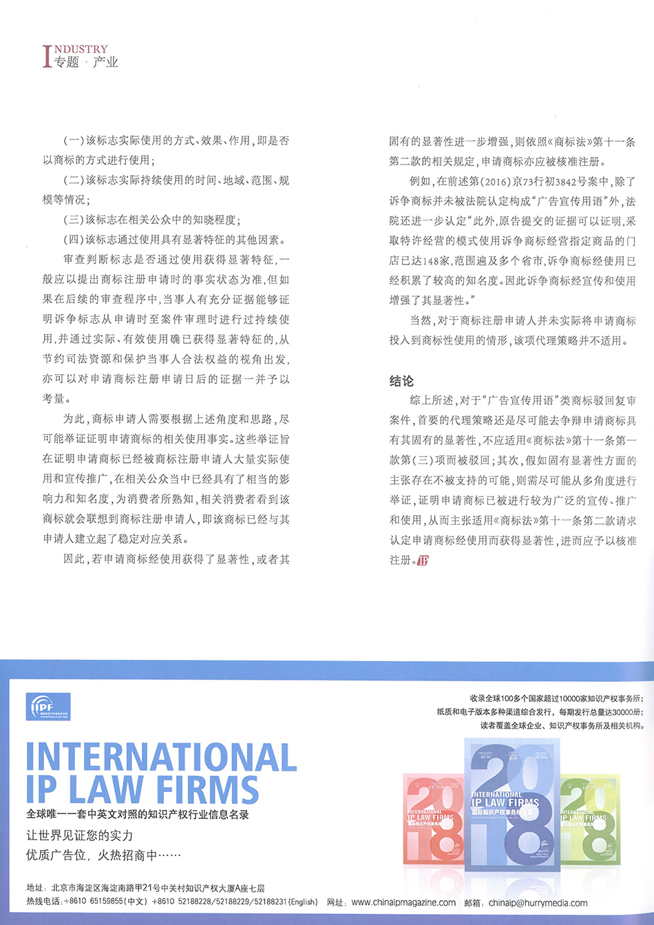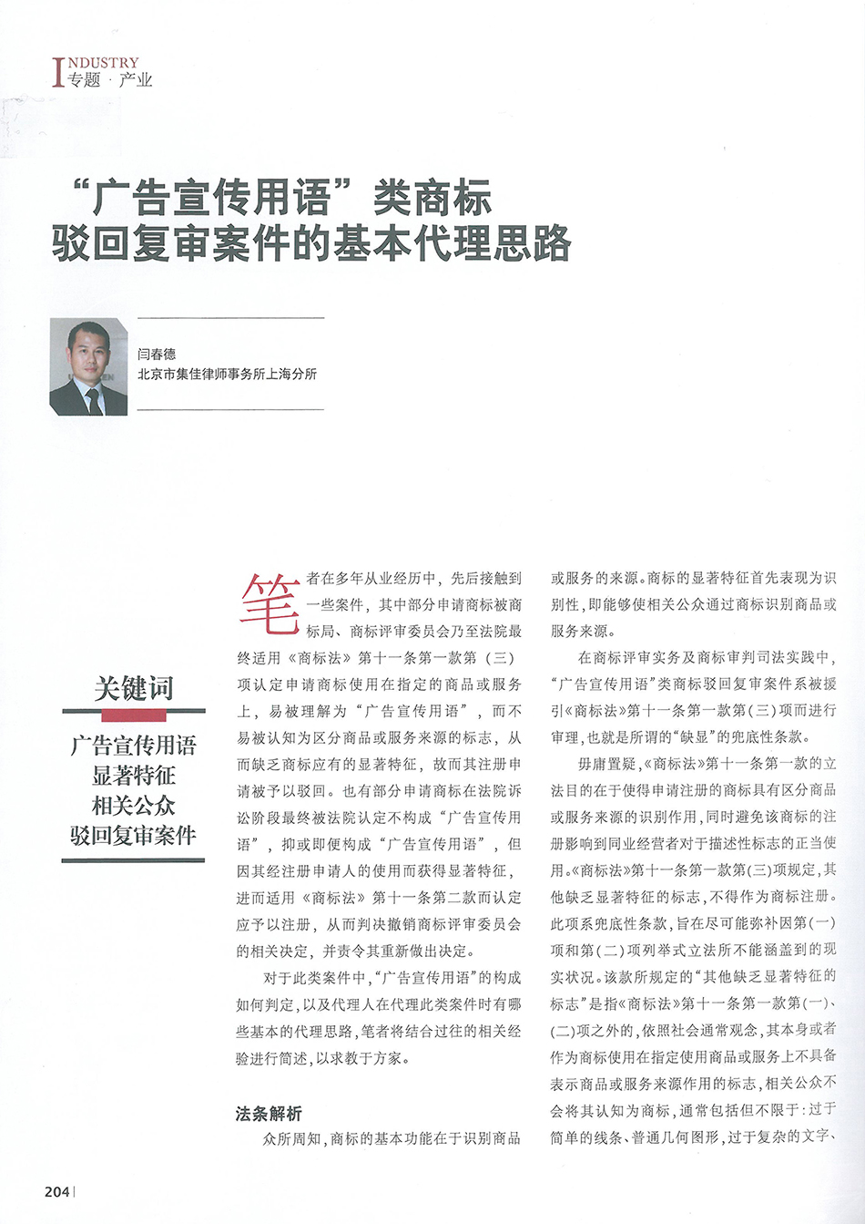 集佳文章《“廣告宣傳用語(yǔ)”類商標(biāo)駁回復(fù)審案件的基本代理思路》在《中國(guó)知識(shí)產(chǎn)權(quán)》發(fā)表