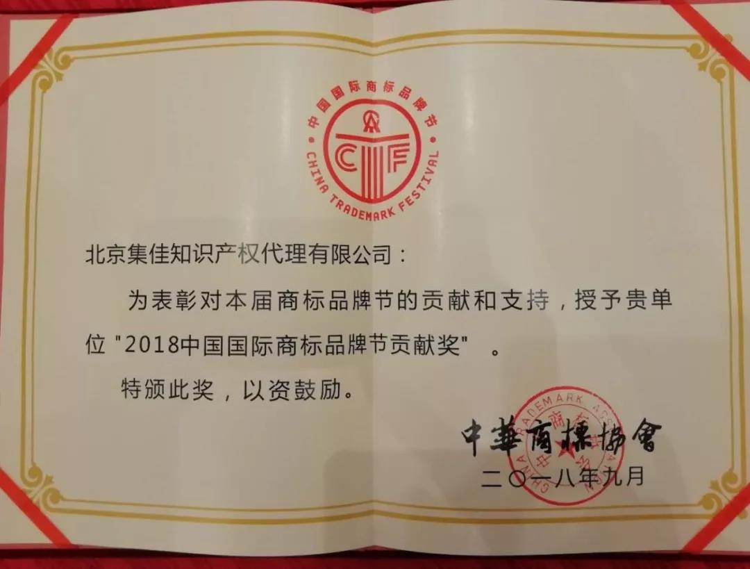 集佳喜獲“2018中國(guó)國(guó)際商標(biāo)品牌節(jié)貢獻(xiàn)獎(jiǎng)”