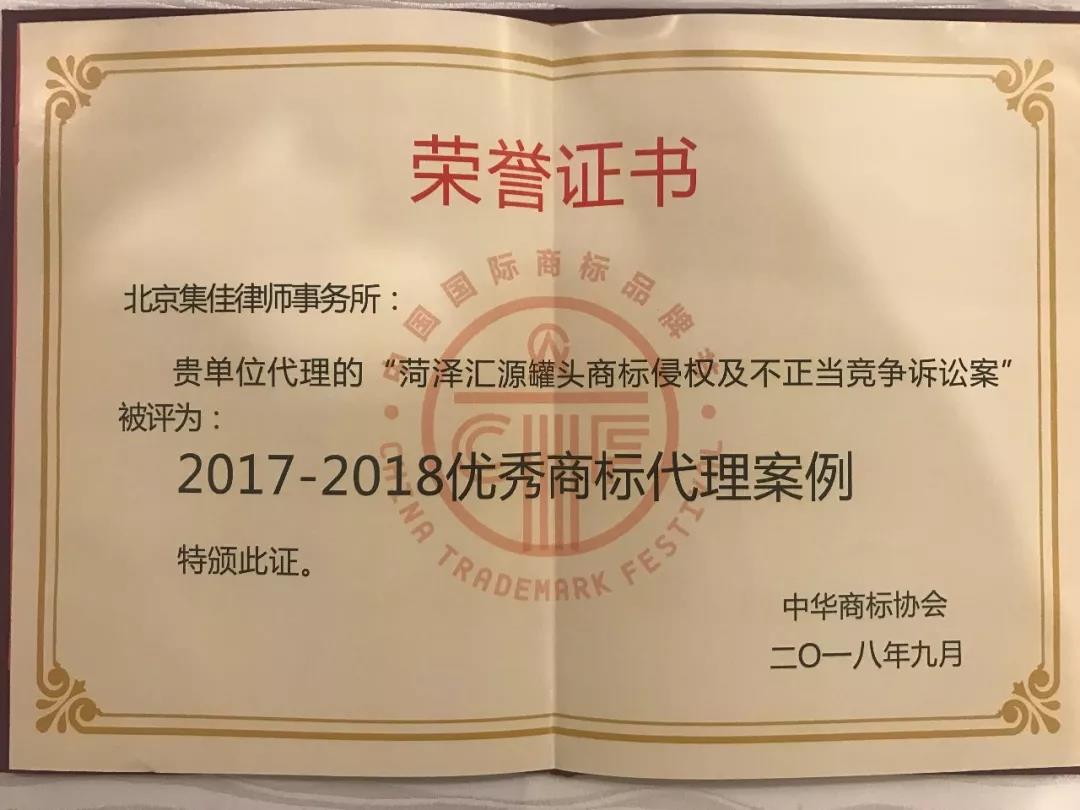2018中國國際商標(biāo)品牌節(jié)進(jìn)行到第二日,又一令人期待的獎項(xiàng)頒布了。中華商標(biāo)協(xié)會梳理和回顧了過去一年商標(biāo)領(lǐng)域發(fā)生的重大典型事件、案件,從參加申報(bào)的眾多商標(biāo)代理案例中評選出了26件年度商標(biāo)典型案例,以此樹立優(yōu)秀案例標(biāo)桿,發(fā)揮示范指導(dǎo)效應(yīng)。集佳律師事務(wù)所代理的“菏澤匯源罐頭商標(biāo)侵權(quán)及不正當(dāng)競爭訴訟案”成功入選“2017-2018優(yōu)秀商標(biāo)代理案例”。