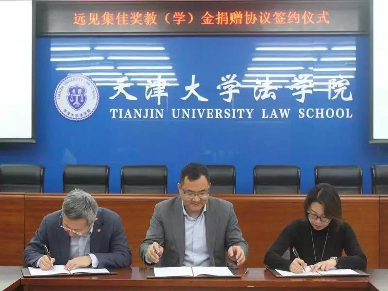 2018年12月29日,“天津大學(xué)法學(xué)院遠(yuǎn)見集佳獎教(學(xué))金”捐贈協(xié)議簽訂儀式在津舉行。中關(guān)村遠(yuǎn)見知識產(chǎn)權(quán)創(chuàng)新研究院理事長高巍,北京市集佳律師事務(wù)所主任李永波律師,天津大學(xué)校友與基金事務(wù)處處長潘峰、任杰老師和天津大學(xué)法學(xué)院院長孫佑海,副書記、副院長李明,郭貴雨老師等出席。