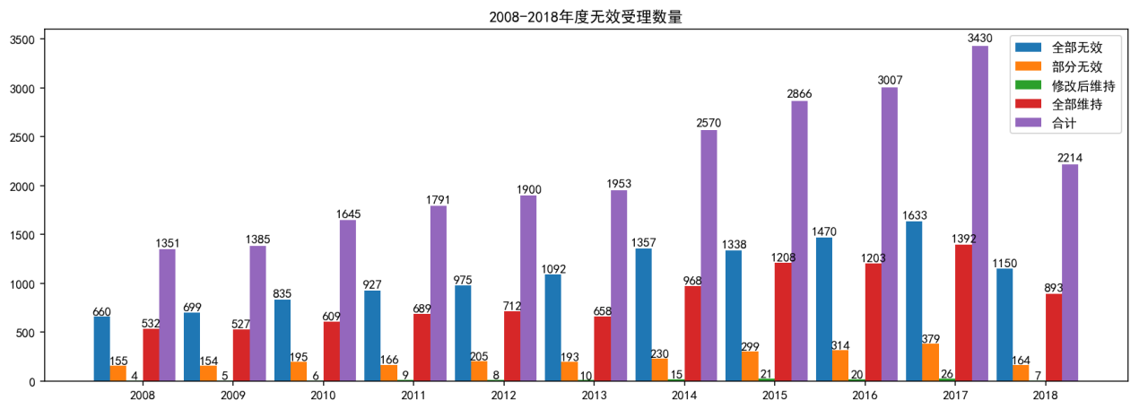 【2】需要說明的是,復審委網站公開的數(shù)據(jù)本身存在一些問題(例如個別決定存在信息缺失錯誤等,尤其是早期發(fā)布的無效決定信息錯誤較多),因此,筆者在統(tǒng)計過程中剔除了一些錯誤或無法使用的數(shù)據(jù),并重點統(tǒng)計了2008年后近十年的數(shù)據(jù)??紤]到數(shù)據(jù)的剔除以及編寫的算法可能存在的不足,下面的統(tǒng)計結果會存在一定誤差。另外,考慮到無效決定都是已經完結的案件,下面的全部統(tǒng)計分析都沒有包括尚處于無效程序中的案件。