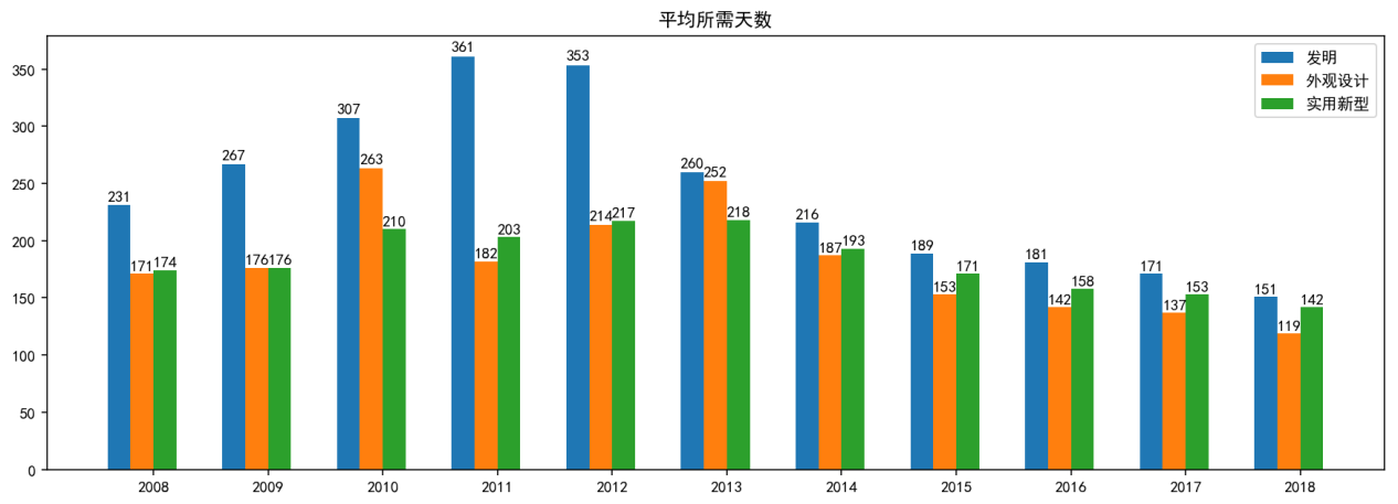 ?。?)無論在哪一個年度,發(fā)明專利的耗時都要比其它二者更長;一般情況下,外觀設計專利用時最短。