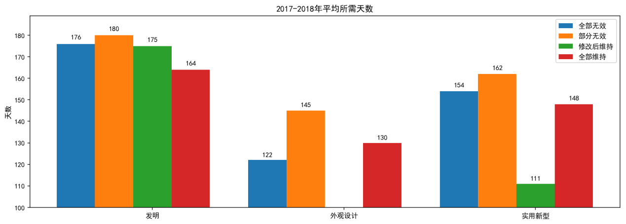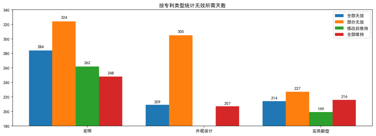 上圖為按專利類型統(tǒng)計的無效請求作出決定平均所用天數(shù)??傮w上看,發(fā)明專利無效決定的用時要多于外觀設計專利和實用新型專利,其中,每一類型下都是部分維持的決定耗時最久。這可能是由于與全部維持或者全部無效相比,部分維持的案件可能相對更加復雜,更難以作出決定。