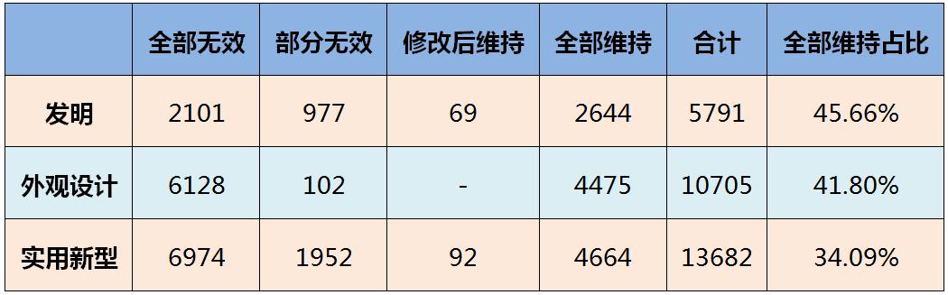 上表為按專利類型統(tǒng)計的各種情況的案件數(shù)量??傮w上看,發(fā)明專利宣告維持的比例要遠高于外觀設計專利和實用新型專利,即專利被宣告無效的概率從發(fā)明專利到外觀設計專利再到實用新型專利是逐步增加的,這也與我們一般的認識相符。某種程度上,實用新型專利的低穩(wěn)定性,大幅增加了專利整體被宣告無效的比例。