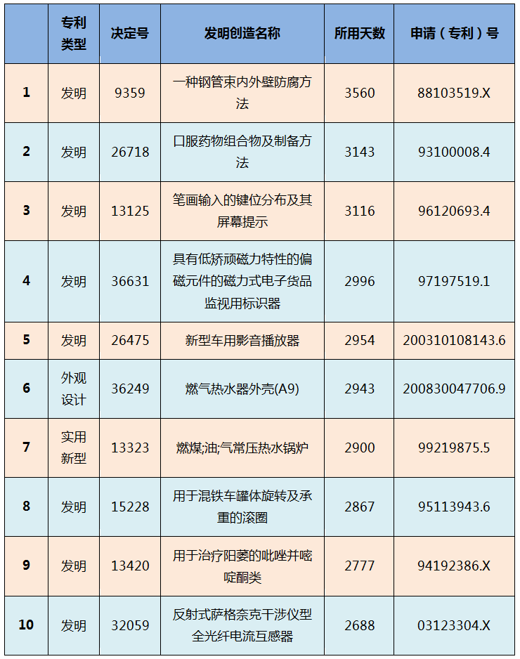 另外,上述總體平均用時與一般經驗相比明顯過長。對此,筆者統(tǒng)計了用時最長的決定,初步可以判斷用時較長(例如超過1年)的案件均涉及一次或者多次行政訴訟,因此耗時較長。其中前10個耗時最長的決定列表如下,以供參考: