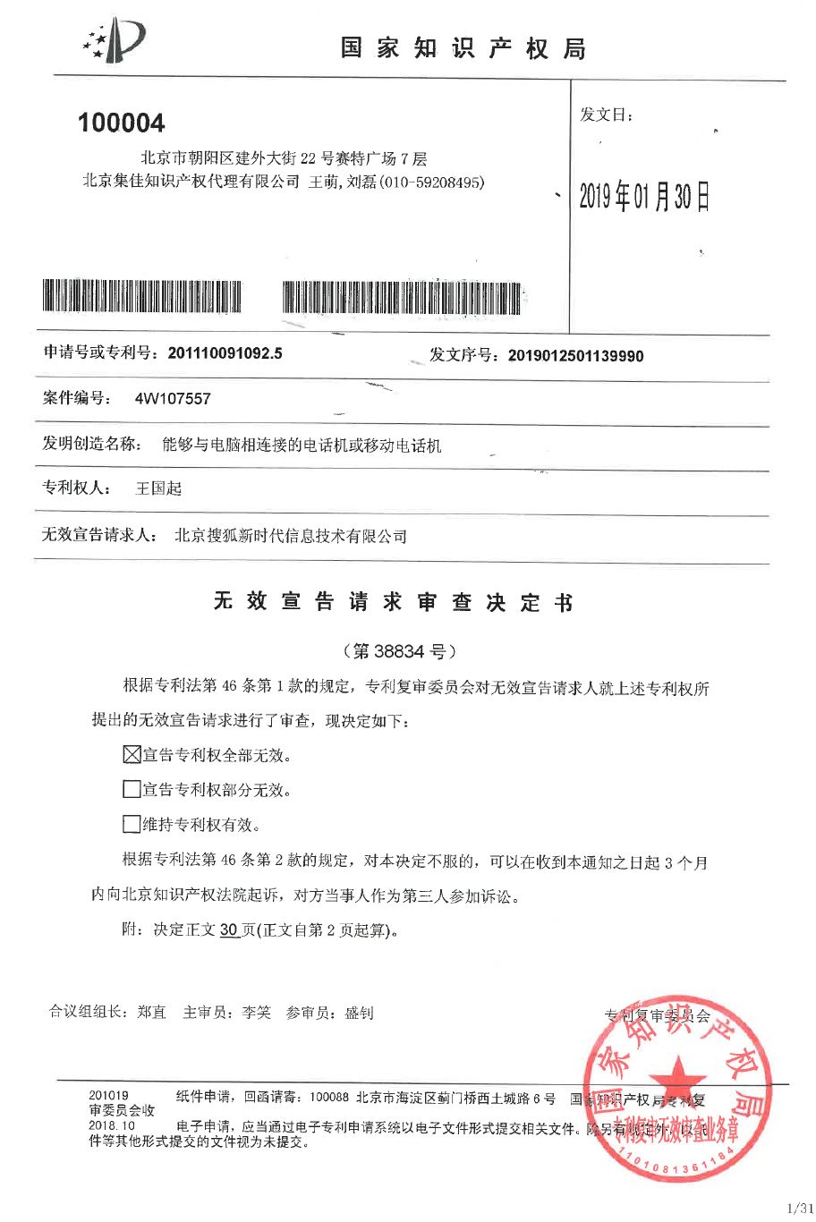 由于存在諸多特殊性,本案受到行業(yè)的高度關(guān)注。集佳公司接受搜狐公司委托,組建經(jīng)驗(yàn)豐富的專利無(wú)效團(tuán)隊(duì),團(tuán)隊(duì)成員深知該案的重要性,以高標(biāo)準(zhǔn)嚴(yán)要求的態(tài)度認(rèn)真對(duì)待無(wú)效過(guò)程中的每個(gè)環(huán)節(jié),從前期對(duì)比文件檢索,到無(wú)效請(qǐng)求材料的準(zhǔn)備,證據(jù)的補(bǔ)充,以及后期的口頭審理,承委托人之信任,擔(dān)盡力成事之責(zé)任,終于實(shí)現(xiàn)了委托人搜狐的期望,在新年來(lái)臨之前,收到復(fù)審委做出的無(wú)效決定。