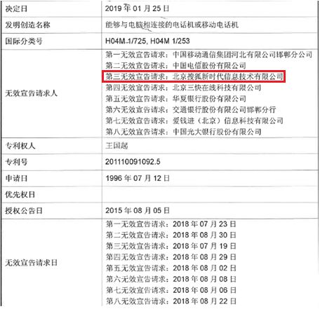 涉案專利名稱為“能夠與電腦相連接的電話機(jī)或移動(dòng)電話機(jī)”,基于該專利,專利權(quán)人王國(guó)起自封“發(fā)漢字和圖像信息的電話機(jī)/移動(dòng)電話機(jī)的全世界首創(chuàng)人”。2018年,王國(guó)起同時(shí)與中國(guó)移動(dòng)、聯(lián)通、電信、搜狐、蘋(píng)果、華為、小米、錘子、農(nóng)行、交行等等30余家企業(yè)發(fā)生專利侵權(quán)行政糾紛,涉案金額共計(jì)數(shù)十億元之多。