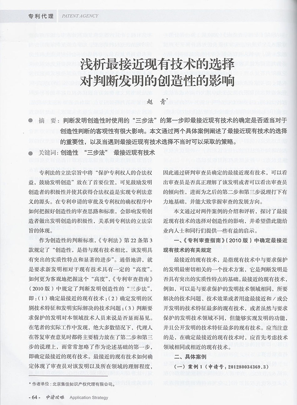 集佳文章《淺析最接近現(xiàn)有技術(shù)的選擇對判斷發(fā)明的創(chuàng)造性的影響》在《專利代理》發(fā)表