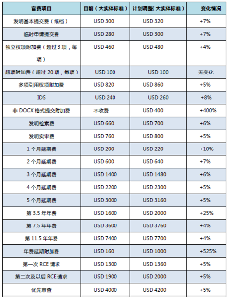 本次官費(fèi)調(diào)整計(jì)劃基本涵蓋各項(xiàng)官費(fèi),包括2018年1月實(shí)施的新官費(fèi)表中未調(diào)整的年費(fèi)、OA答復(fù)延期費(fèi)等,最大的調(diào)整包括專利訴訟請求費(fèi)上調(diào)25%,年費(fèi)遲交滯納金上調(diào)525%,外觀加速審查費(fèi)上調(diào)122%,新增非DOCX文件的提交費(fèi)。