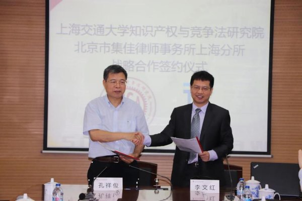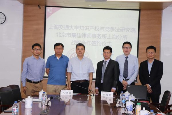 6月26日,北京市集佳律師事務(wù)所上海分所與上海交通大學(xué)知識(shí)產(chǎn)權(quán)與競(jìng)爭(zhēng)法研究院戰(zhàn)略合作協(xié)議簽約儀式在上海交大徐匯校區(qū)凱原法學(xué)樓隆重舉行。上海交通大學(xué)知識(shí)產(chǎn)權(quán)與競(jìng)爭(zhēng)法研究院院長(zhǎng)孔祥俊教授、劉維副教授,北京市集佳律師事務(wù)所上海分所主任李文紅、資深顧問(wèn)王俊河、合伙人李擘、合伙人張振軍出席簽約儀式。