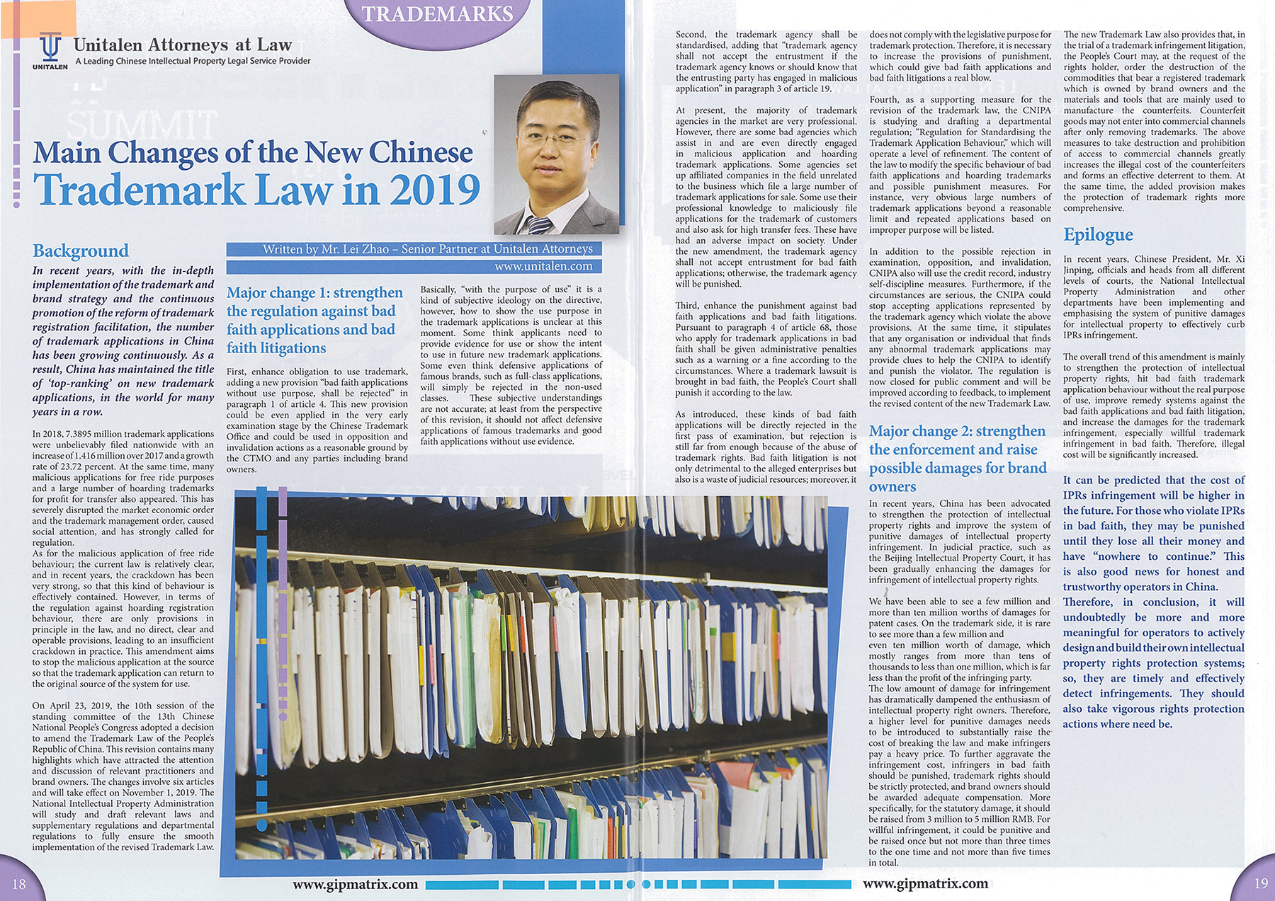 集佳合伙人趙雷律師文章《Main Changes of the New Chinese Trademark Law in 2019》在《Global IP Matrix》發(fā)表