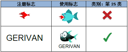 一般而言,當(dāng)增加的要素為顯著要素,與已注冊(cè)標(biāo)志相互作用,而使已注冊(cè)標(biāo)志不具有獨(dú)立性時(shí),則視為顯著要素變更,不能視為注冊(cè)標(biāo)志的使用,如以下示例中,雖然均增加了大魚圖形的設(shè)計(jì),但對(duì)第一組而言,形成了“大魚吃小魚”的新的標(biāo)識(shí)含義,因而改變了原標(biāo)志的顯著特征: