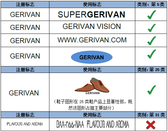 如上述示例,注冊(cè)商標(biāo)指定在第32類礦泉水商品上,相較而言,圖形對(duì)指定商品具有一定暗示性,而顯著性較弱。因此,文字部分“GERIVAN”為該注冊(cè)商標(biāo)的主要顯著部分。第一組中的使用標(biāo)志僅是對(duì)圖形和文字的位置進(jìn)行了調(diào)整,不影響文字部分的顯著性。而第二組的使用標(biāo)志對(duì)文字進(jìn)行了拆分,形成了新的商業(yè)印象,故視為實(shí)質(zhì)變更。