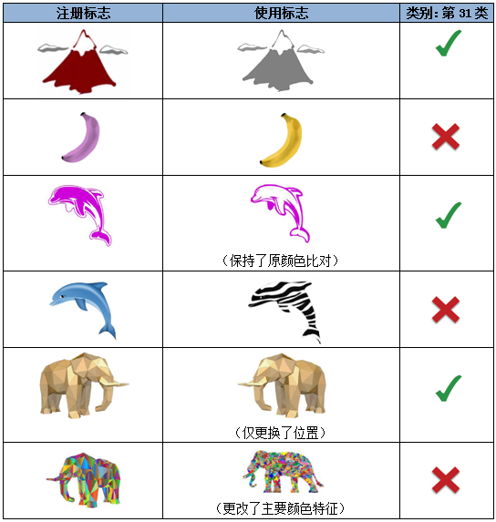 需要留意的是,對(duì)于黑白商標(biāo)和彩色商標(biāo),更換顏色(如黑白更換為彩色,或彩色更換為黑白),與國(guó)內(nèi)的判斷標(biāo)準(zhǔn)稍有不同。根據(jù)本指南,顏色更改是否構(gòu)成注冊(cè)標(biāo)志的實(shí)質(zhì)變更,判斷標(biāo)準(zhǔn)仍主要取決于是否對(duì)注冊(cè)標(biāo)志的顯著要素構(gòu)成更改,換句話說,“顏色”是否為該注冊(cè)標(biāo)志的顯著要素。如上述示例七中第二組,指定商品為第31類“香蕉”,因此,該注冊(cè)標(biāo)志中的“粉色”為該注冊(cè)商標(biāo)的主要顯著部分,更改為其他顏色則構(gòu)成實(shí)質(zhì)變更,而如上述示例七中的第一、三組,顏色并非注冊(cè)商標(biāo)的主要顯著部分,則可以在使用中更換標(biāo)志的顏色。