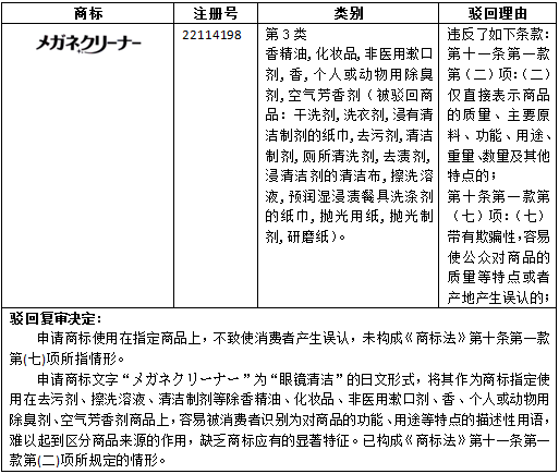該件商標由日文片假名組成,如果僅從外觀考量,不會產(chǎn)生導致消費者誤認或者缺乏顯著性的可能,但審查員在裁定中明確指明了該單詞的含義,并判定“缺乏商標應有的顯著特征”。
