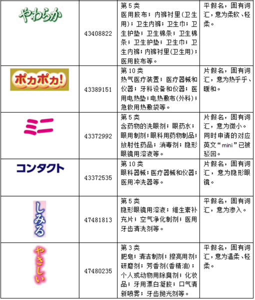 以上商標均為日文假名商標,目前都通過初審獲得注冊。從商標的外觀來看,對于未學習過日語的一般消費者來說,無法理解其含義,消費者對該類商標最多停留在外文商標這一認識程度,對外觀的記憶很難達到深刻或準確的程度。但對于有一定程度的日語學習者來說,上述單詞都屬于日語中十分簡易且常見常用的單詞,根據(jù)上表中對各個商標含義的介紹,可以判斷出,對于熟悉日語的相關消費者,上述商標在其對應的指定商品上使用,恐難以起到區(qū)分商品來源的作用。