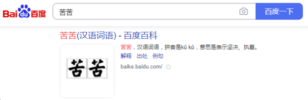 在對商標進行含義解釋時,萬不可將其割裂開來,進行個字認讀,應以商標整體構成要素進行統(tǒng)一認讀。申請商標“苦苦”為統(tǒng)一而不可分割的整體,系固有詞匯,具有固定的含義指向。常見于相關公眾的口語表述中,如辛辛苦苦、苦苦哀求等詞語,具有堅決、執(zhí)著、懇切等含義。