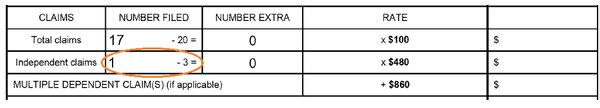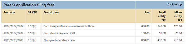 其中大部分項目的費用是固定的,僅取決于申請人的規(guī)模是大實體、小實體還是微實體。有一定操作空間的是申請?zhí)峤粫r的費用(patent application filing fees),其中與權(quán)利要求相關(guān)的主要是以下幾條: