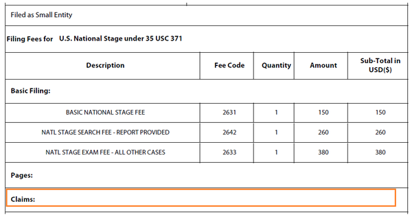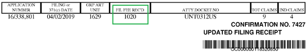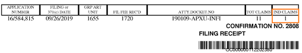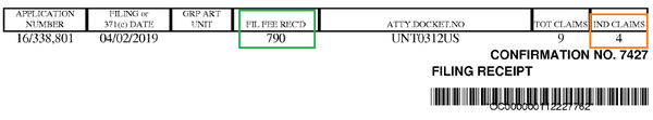 在USPTO發(fā)出的受理通知書上,可以看到官方認定的獨立權(quán)利要求數(shù)為4,同時顯示官方收到的申請人費用(綠色方框),參見下圖: