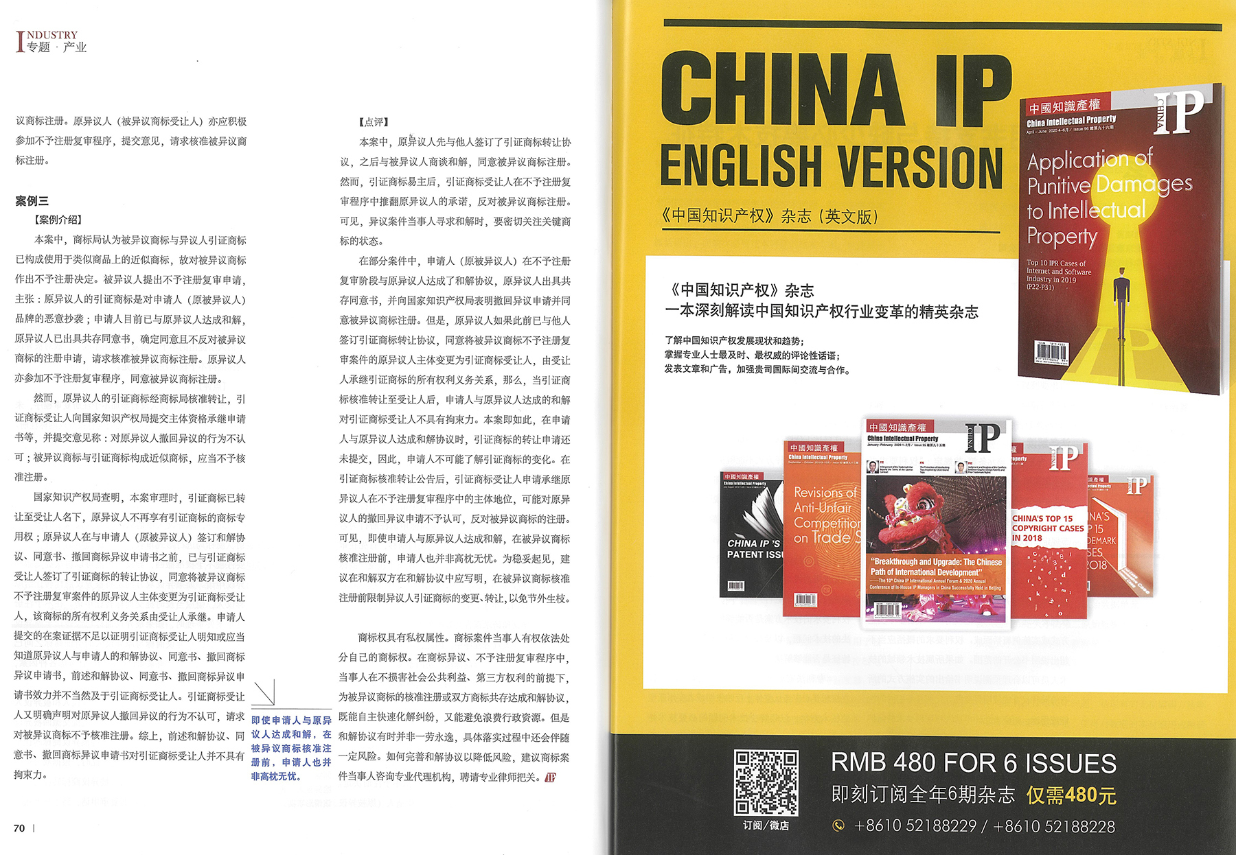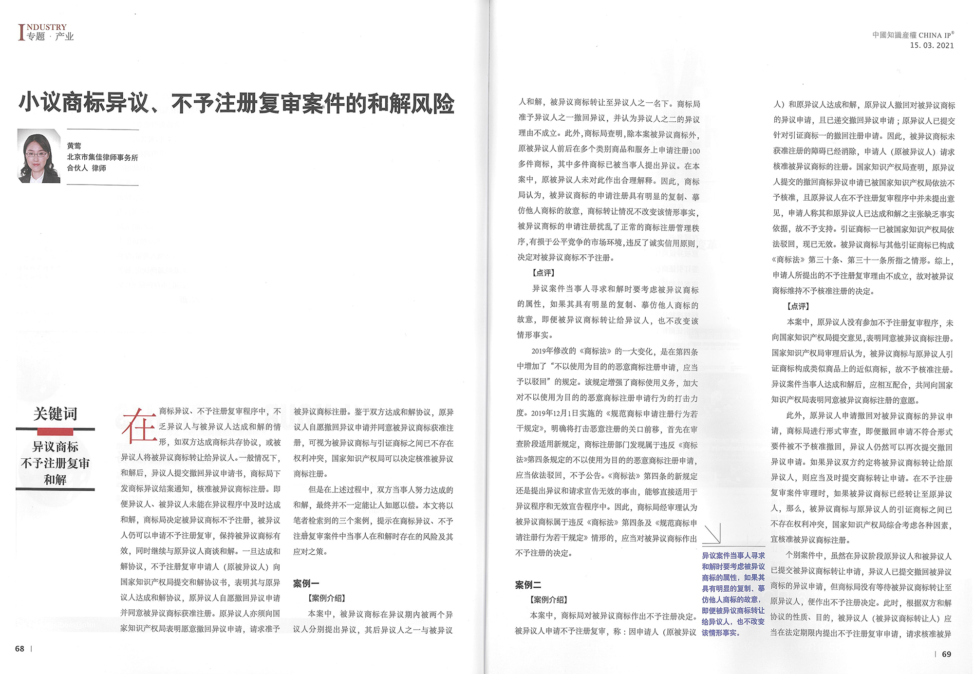 集佳文章《小議商標(biāo)異議、不予注冊(cè)復(fù)審案件的和解風(fēng)險(xiǎn)》在《中國(guó)知識(shí)產(chǎn)權(quán)》發(fā)表