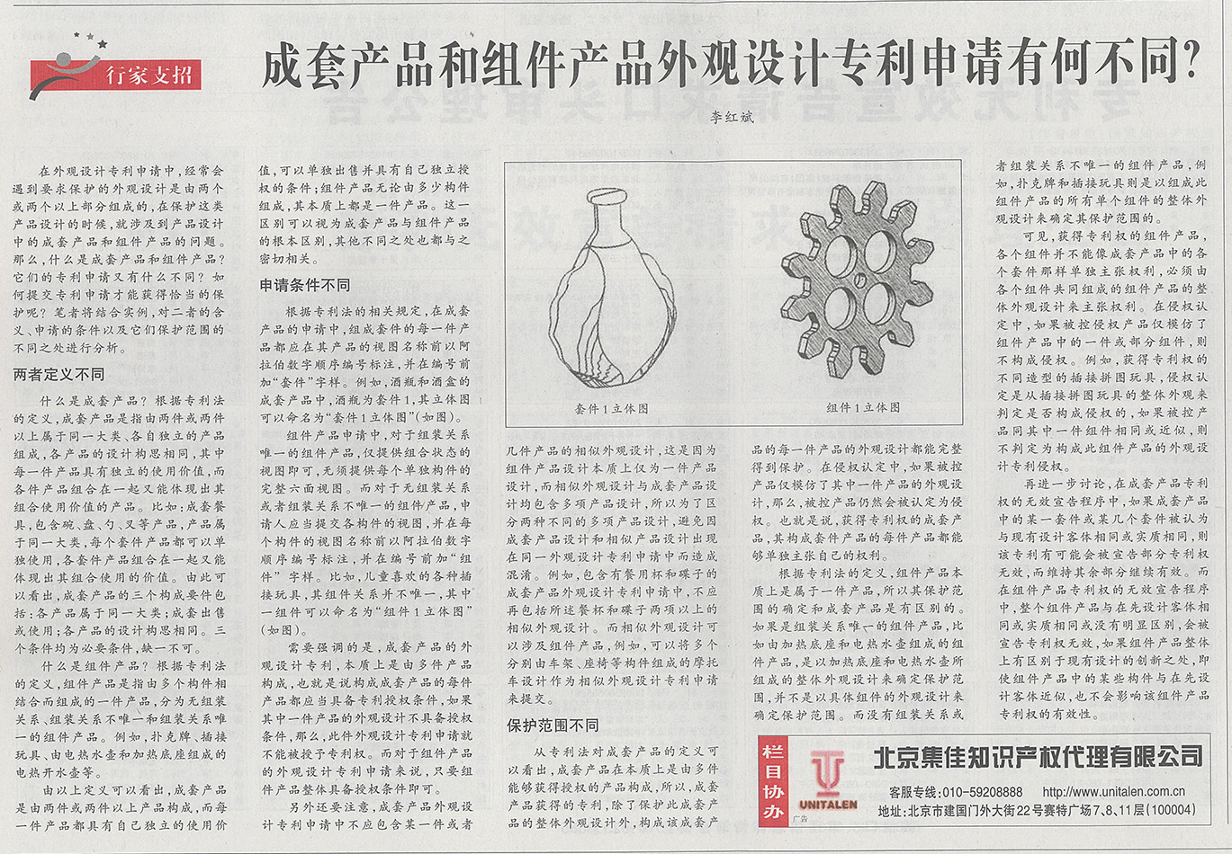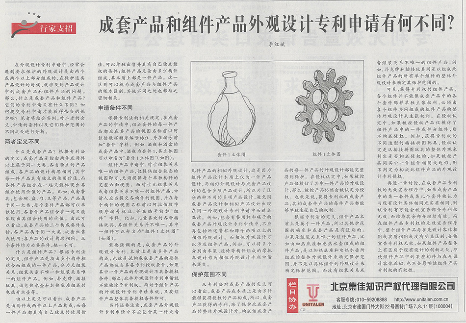集佳文章《成套產(chǎn)品和組件產(chǎn)品外觀設(shè)計專利申請有何不同?》在《中國知識產(chǎn)權(quán)報》發(fā)表