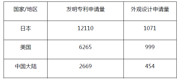 2020年向中國臺灣地區(qū)申請的前三大國家和地區(qū)申請量,見下表: