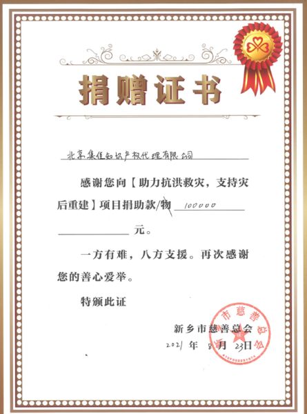 風(fēng)雨無(wú)情人有情,一方有難,八方支援。災(zāi)情發(fā)生后,集佳迅速響應(yīng)號(hào)召,通過(guò)中共首都知識(shí)產(chǎn)權(quán)服務(wù)業(yè)協(xié)會(huì)委員會(huì)向河南受災(zāi)地區(qū)捐贈(zèng)10萬(wàn)元,用于支援抗汛和災(zāi)后重建工作。許多集佳員工也在第一時(shí)間獻(xiàn)出愛(ài)心,自發(fā)向?yàn)?zāi)區(qū)捐款捐物,幫助受災(zāi)群眾渡過(guò)難關(guān),重建家園。