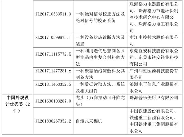 6月25日,國(guó)家知識(shí)產(chǎn)權(quán)局發(fā)布了第二十二屆中國(guó)專利獎(jiǎng)授獎(jiǎng)決定,為30項(xiàng)發(fā)明、實(shí)用新型專利授予中國(guó)專利金獎(jiǎng),10項(xiàng)外觀設(shè)計(jì)專利授予中國(guó)外觀設(shè)計(jì)金獎(jiǎng),60項(xiàng)發(fā)明、實(shí)用新型專利中國(guó)專利銀獎(jiǎng),15項(xiàng)外觀設(shè)計(jì)專利中國(guó)外觀設(shè)計(jì)銀獎(jiǎng),825項(xiàng)發(fā)明、實(shí)用新型專利中國(guó)專利優(yōu)秀獎(jiǎng),56項(xiàng)外觀設(shè)計(jì)專利中國(guó)外觀設(shè)計(jì)優(yōu)秀獎(jiǎng)。
