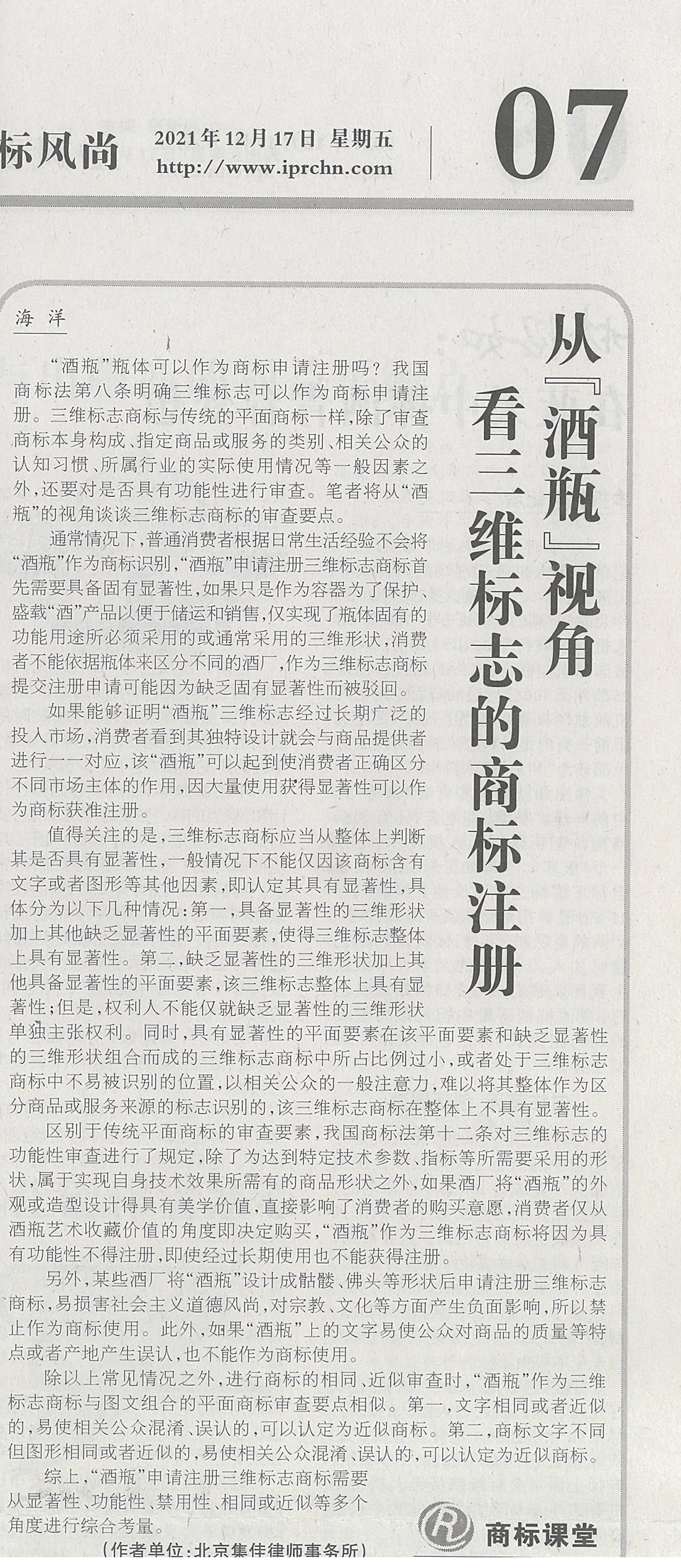 集佳文章《從「酒瓶」視角看三維標(biāo)志的商標(biāo)注冊(cè)》在《中國知識(shí)產(chǎn)權(quán)報(bào)》發(fā)表