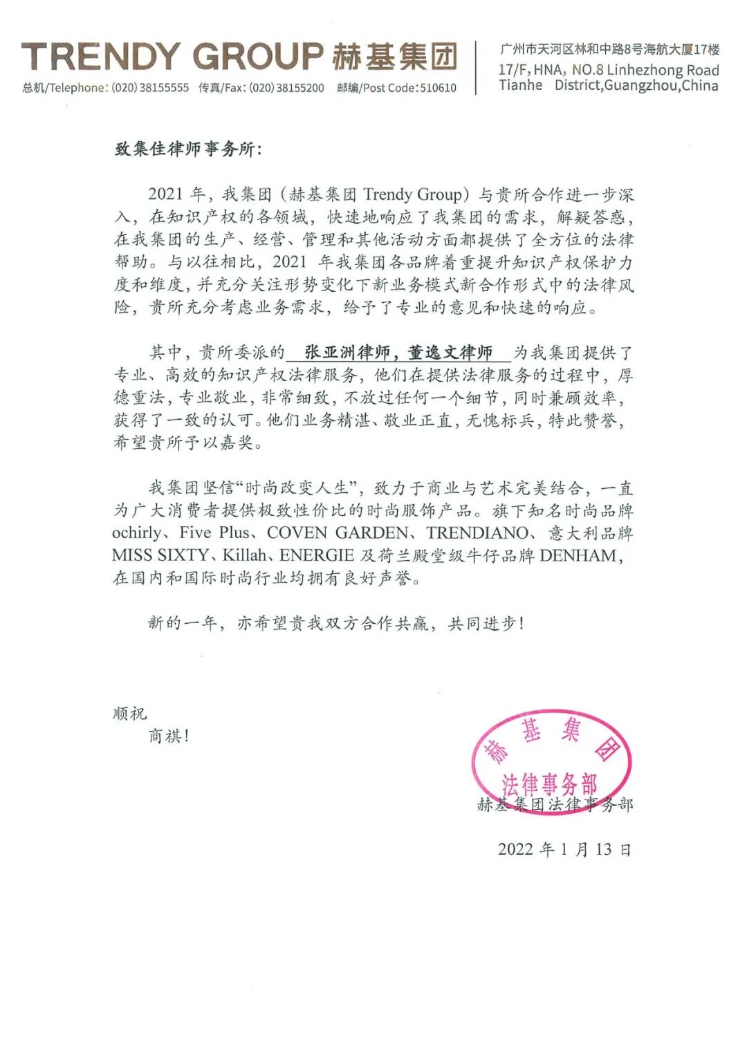 新春佳節(jié)將至,集佳收到赫基集團發(fā)來的表揚信,贊譽集佳律師事務(wù)所張亞洲律師董逸文律師專業(yè)、高效的知識產(chǎn)權(quán)法律服務(wù)。