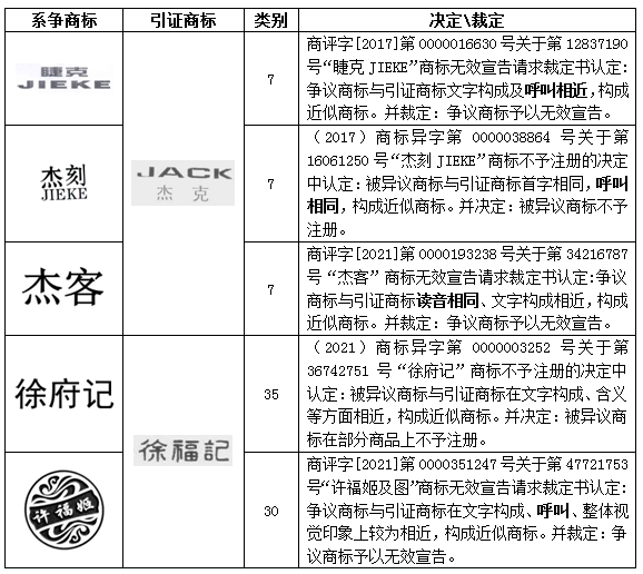 可以看出,上述案件中的系爭商標(biāo)是對針對“杰克”“徐福記”商標(biāo)進(jìn)行的惡意摹仿注冊?!敖芸恕鄙虡?biāo)為杰克科技股份有限公司旗下的品牌,使用在第7類“縫紉機(jī)”等商品上,曾被認(rèn)定為馳名商標(biāo),并多次獲得馳名保護(hù)?!靶旄S洝睘樾旄S泧H控股集團(tuán)有限公司旗下品牌,同樣曾被認(rèn)定為馳名商標(biāo),并多次獲得馳名保護(hù)。這兩件商標(biāo)均具有較高的知名度及影響力,也是被其他主體大量惡意摹仿注冊的對象,對于上述惡意摹仿的與“杰克”“徐福記”讀音相同的商標(biāo),在異議及無效宣告中均被認(rèn)定與引證商標(biāo)近似。