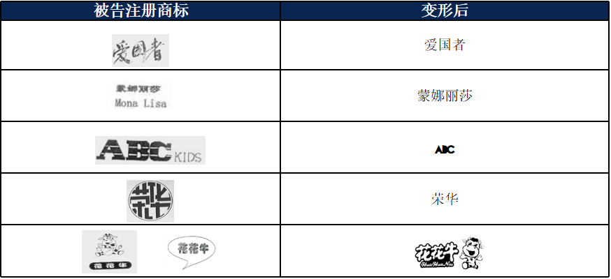 ”被認(rèn)定構(gòu)成“變形使用”、侵權(quán)成立。(2)若由于商業(yè)使用環(huán)境等客觀需要,導(dǎo)致被訴標(biāo)識與注冊樣式稍有差別,一般不輕易判為“變形使用”,如“蒙娜麗莎”“愛國者”“ABC”等案件。法院認(rèn)為,被訴標(biāo)識雖與注冊商標(biāo)有所差異,但未改變顯著特征,仍屬于對注冊商標(biāo)的合理使用。