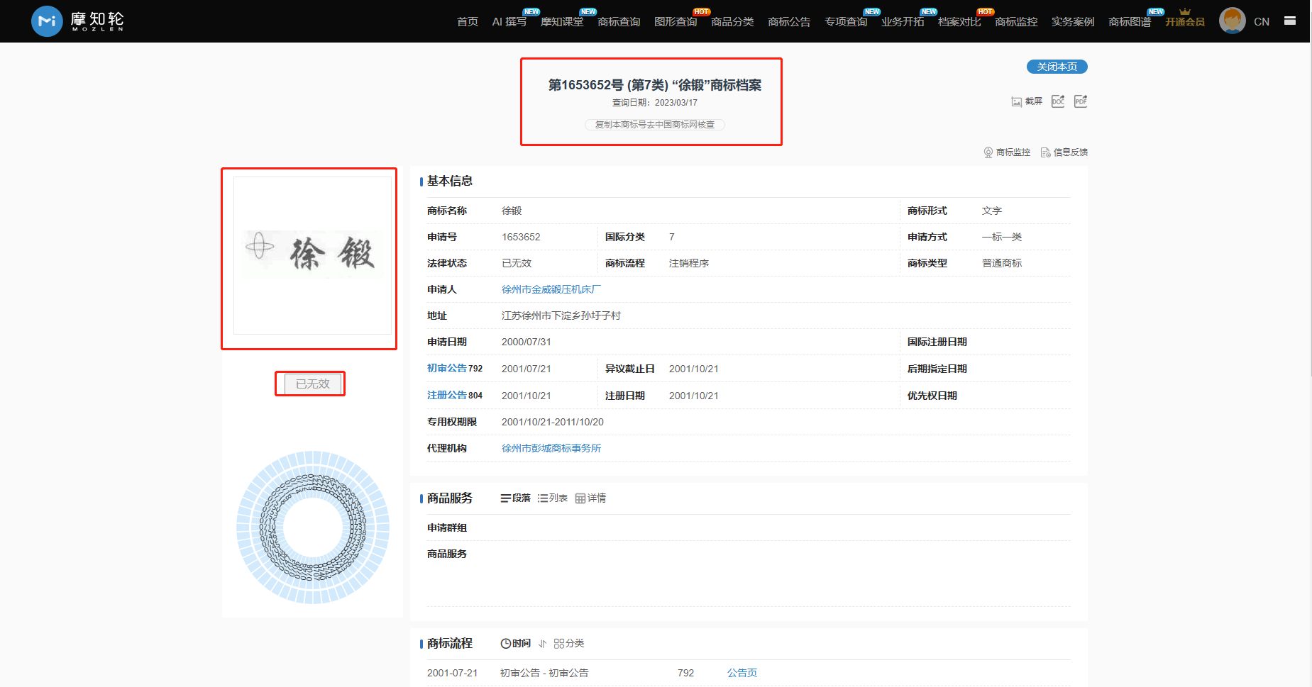 商標局認為:被異議商標“徐鍛及圖”指定使用商品為第7類的“壓力機”。