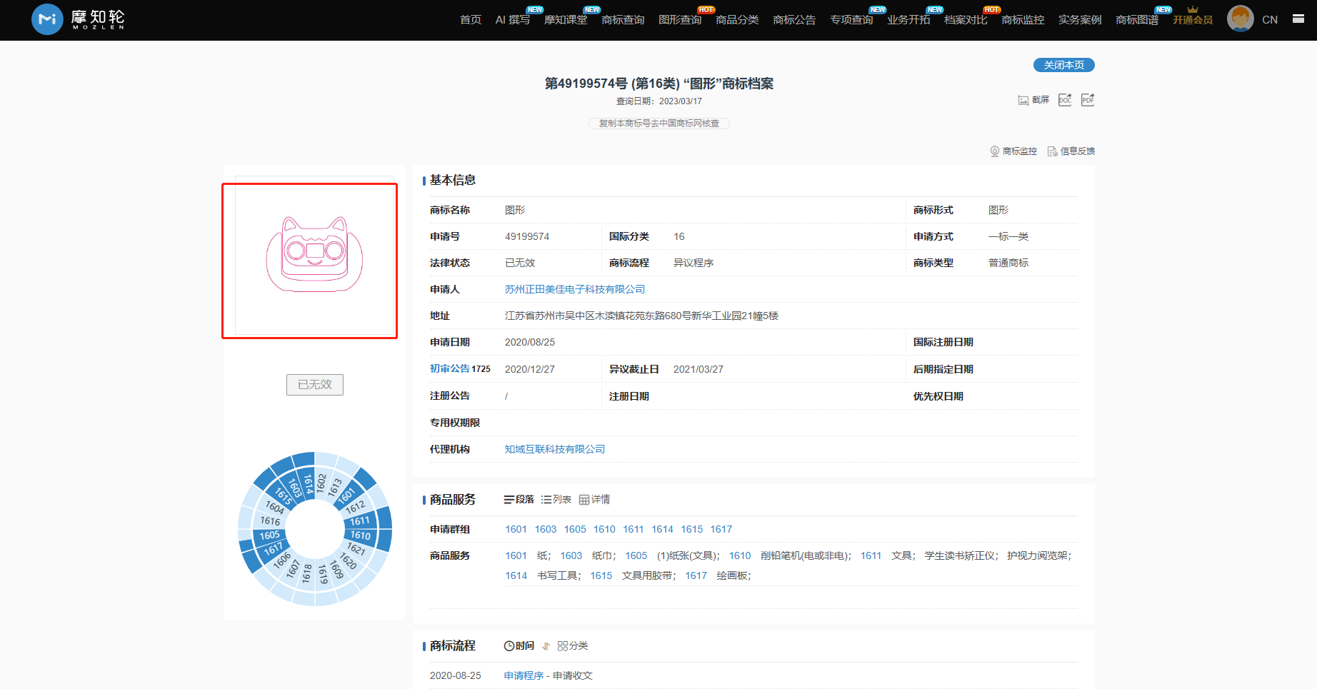 商標局認為:被異議商標指定使用在第16類“紙;削鉛筆機(電或非電)”等商品上。異議人稱被異議人申請注冊被異議商標侵犯其外觀設計專利權(quán),異議人提供的國家知識產(chǎn)權(quán)局出具的專利設計專利權(quán)評價報告顯示,異議人“機器人(喵喵)”專利號ZL202030085792.3,申請日為2020年3月14日,授權(quán)公告日為2020年7月14日,上述日期均早于被異議商標申請日。被異議商標“圖形”與異議人“機器人(喵喵)”外觀設計專利中顯示的主視圖主要構(gòu)圖要素,圖形整體視覺效果相近,已構(gòu)成近似,綜上所述,被異議人申請注冊被異議商標侵犯其外觀設計專利權(quán),被異議商標的申請注冊應不予核準。