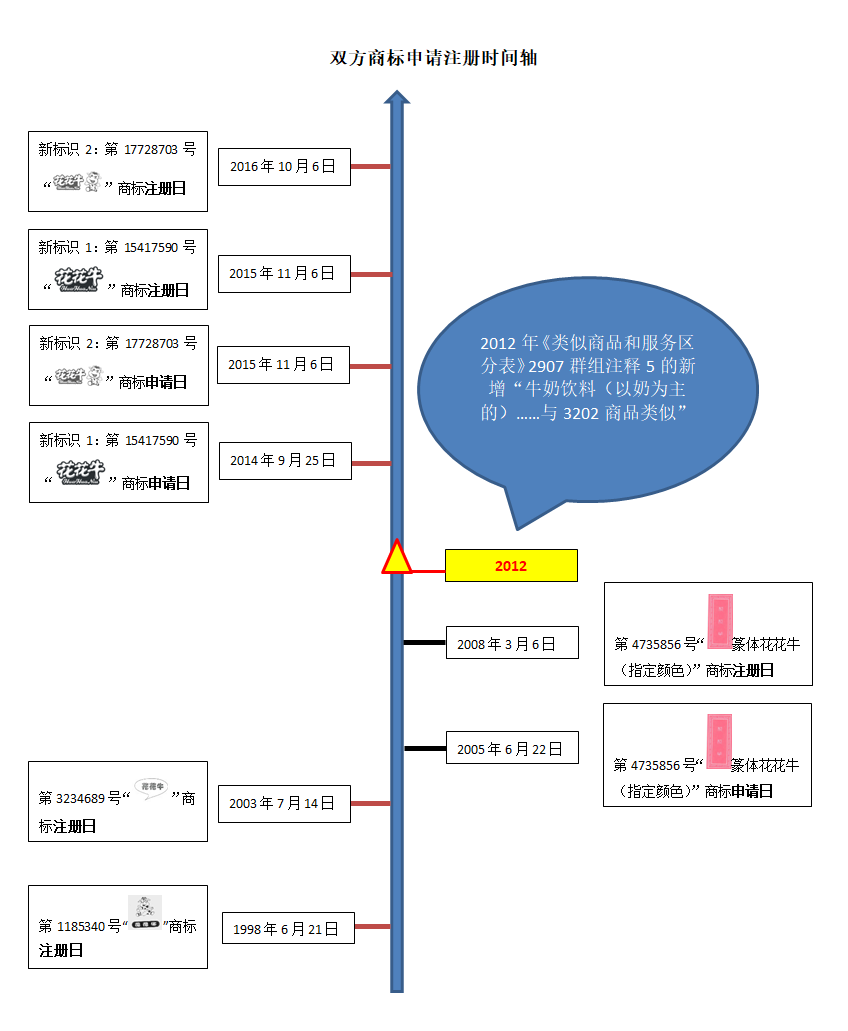 篆體花花牛(指定顏色)”商標挑戰(zhàn)花花牛新標識“圖片”“圖片”在牛奶飲料(以牛奶為主)商品項目上的注冊,導致上述兩個新標識在“牛奶飲料(以牛奶為主)”商品項目上的無效。同時,河南鄭牛還持續(xù)以普通花花牛字體在和花花牛乳業(yè)公司主營商品項目相同、類似或者高度關聯(lián)的商品項目上申請注冊商標,雙方隨即陷入持續(xù)數(shù)年的商標確權僵局。