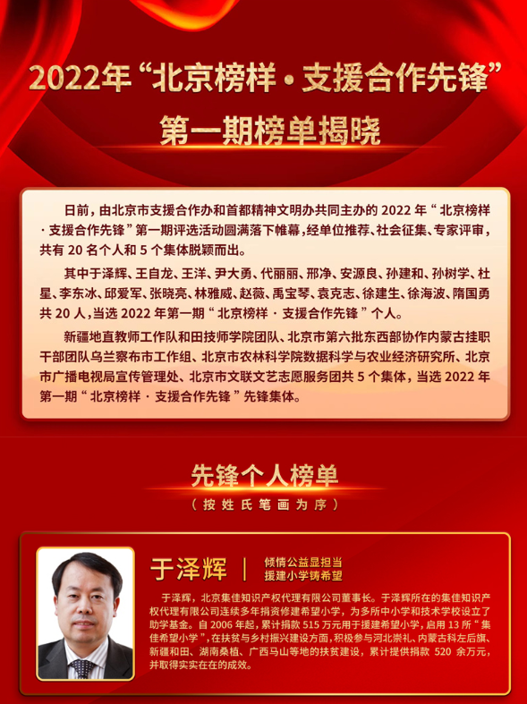 近日,由北京市支援合作辦公室和首都精神文明辦公室共同主辦的2022年“北京榜樣?支援合作先鋒”第一期評選活動(dòng)圓滿落下帷幕,經(jīng)單位推薦、社會(huì)征集、專家評審,共有20名個(gè)人和5個(gè)集體脫穎而出,集佳于澤輝所長榮登“先鋒個(gè)人榜單”!