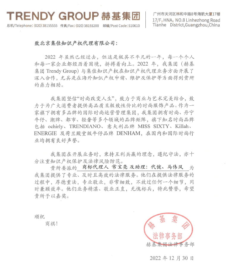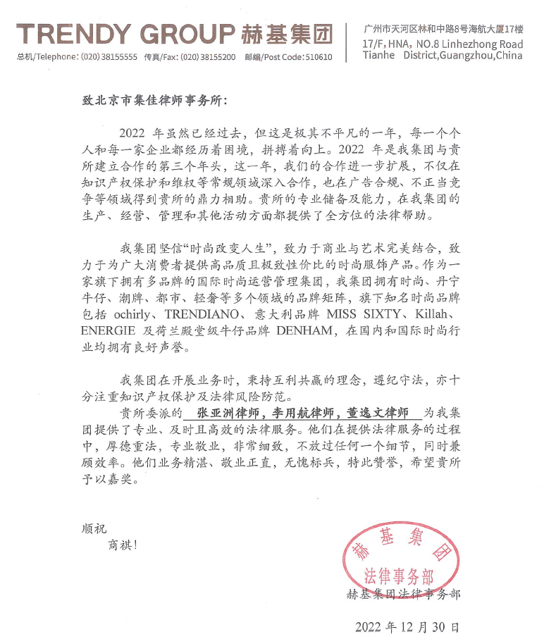 新年伊始,集佳收到來自客戶赫基集團的暖心表揚信,信中對集佳在知識產(chǎn)權(quán)保護和維權(quán)、廣告合規(guī)、不正當(dāng)競爭等領(lǐng)域的優(yōu)質(zhì)服務(wù)、精湛業(yè)務(wù)給予高度認(rèn)可,并對張亞洲、李用航、董逸文、常寶亮、代健、馬偉風(fēng)等集佳專業(yè)人員認(rèn)真負(fù)責(zé)的工作態(tài)度致以高度贊譽,稱贊他們在提供法律服務(wù)的過程中,厚德重法,專業(yè)高效,敬業(yè)正直,無愧標(biāo)兵!