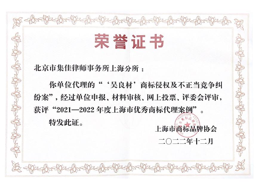 同時(shí),集佳上海分所獲評(píng)“2022年度上海市海外商標(biāo)保護(hù)提名獎(jiǎng)”,以表彰集佳上海分所在幫助中國企事業(yè)單位處理國際商標(biāo)品牌事務(wù)上取得的優(yōu)異成績(jī)。隨著中國經(jīng)濟(jì)的發(fā)展和企業(yè)的成長(zhǎng),集佳上海分所依托總部的支持,長(zhǎng)期致力于為眾多中國企業(yè)處理海外商標(biāo)注冊(cè)、國際保護(hù)和品牌運(yùn)營(yíng)等法律事務(wù),以實(shí)際行動(dòng)助力中國市場(chǎng)主體走向海外市場(chǎng)并應(yīng)對(duì)錯(cuò)綜復(fù)雜的國際知識(shí)產(chǎn)權(quán)法律環(huán)境。多年來,集佳馬德里國際注冊(cè)商標(biāo)的代理量一直穩(wěn)居行業(yè)前列。