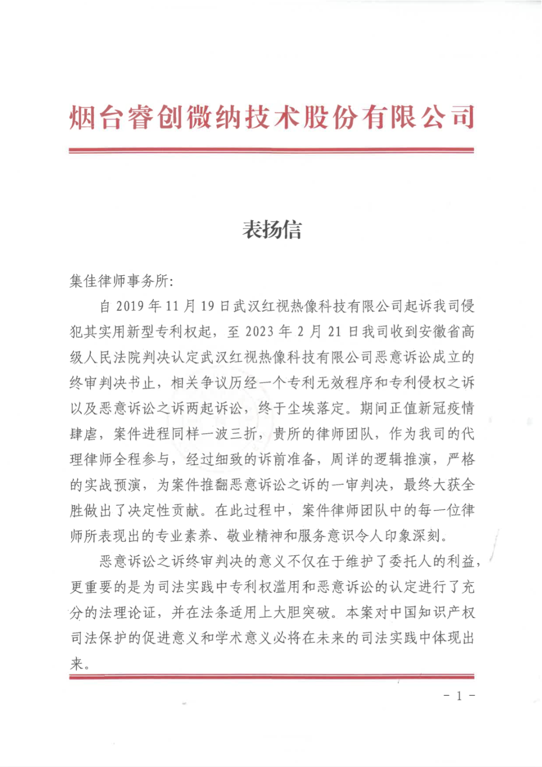 圖1 睿創(chuàng)集團向集佳律所寄送的表揚信