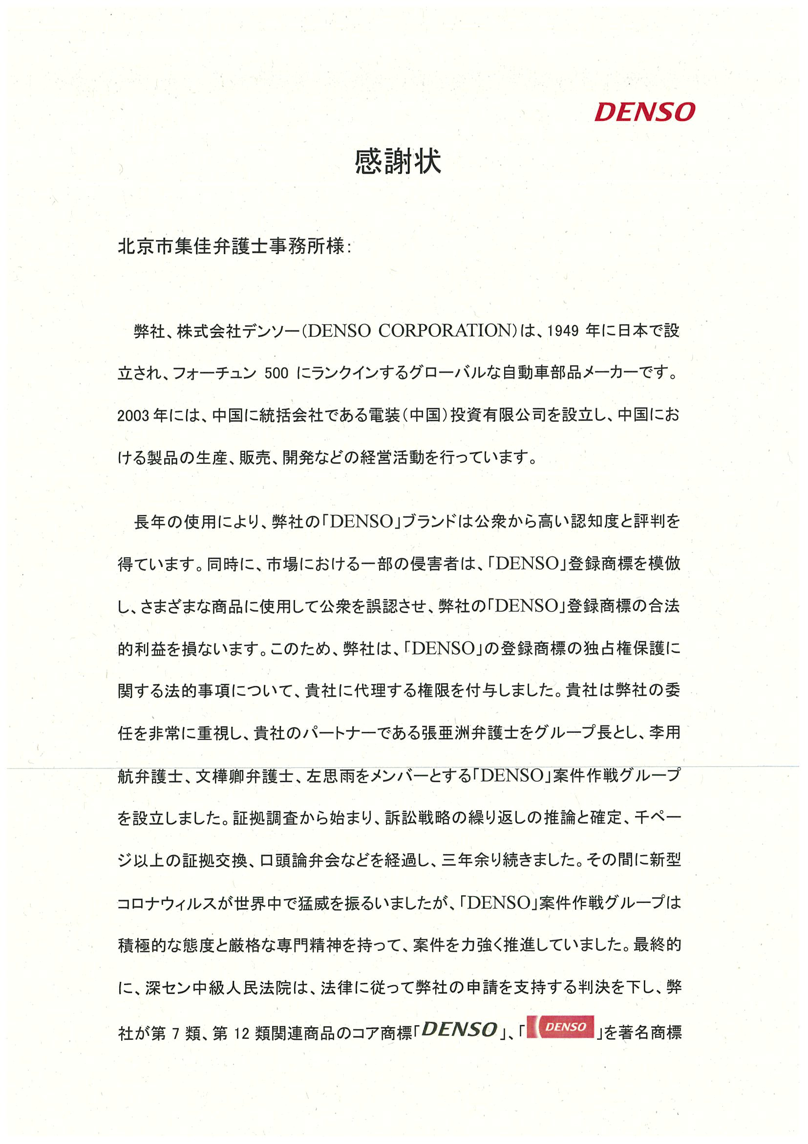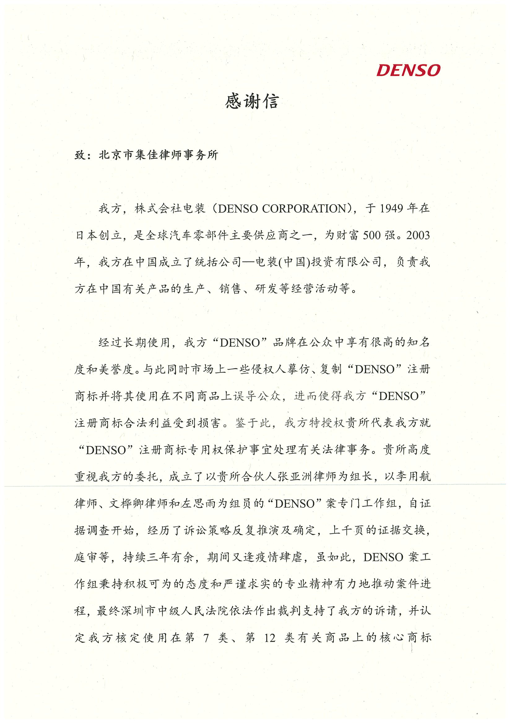 針對市場上一些侵權(quán)人摹仿、復(fù)制“DENSO”注冊商標(biāo)并將其使用在不同類別商品上誤導(dǎo)公眾的不法行為,株式會社電裝委托集佳就“DENSO”注冊商標(biāo)專用權(quán)保護(hù)事宜處理有關(guān)法律事務(wù)。集佳對此高度重視,成立了以合伙人張亞洲律師為組長,以李用航律師、文樺卿律師和左思雨為組員的“DENSO”案專門工作組,自證據(jù)調(diào)查始,經(jīng)歷了訴訟策略反復(fù)推演及確定、上千頁的證據(jù)交換、庭審等,持續(xù)三年有余,期間又逢疫情肆虐,但是DENSO案工作組秉持積極可為的態(tài)度和嚴(yán)謹(jǐn)求實的專業(yè)精神克服重重困難,有力地推動案件進(jìn)程。最終,深圳市中級人民法院依法作出裁判,認(rèn)定株式會社電裝的注冊商標(biāo)“
