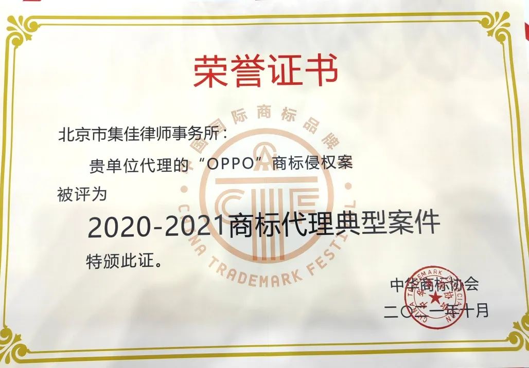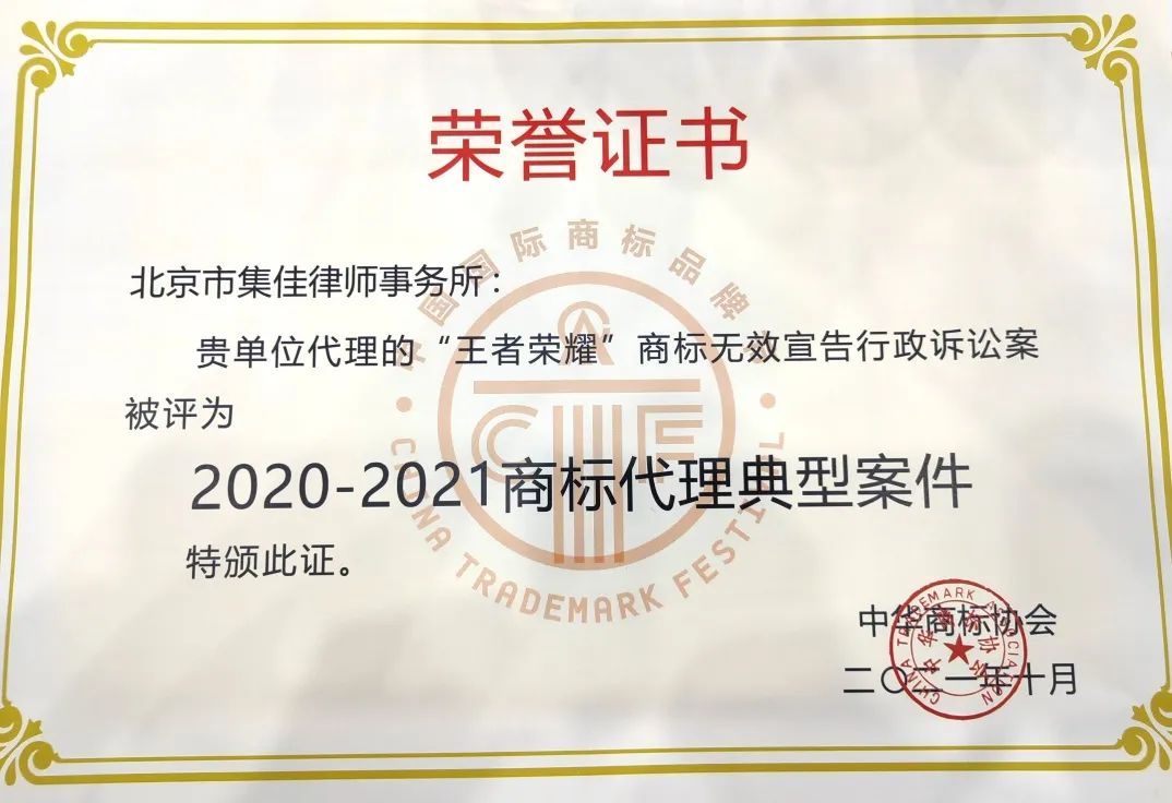 6月17日,第十三屆中國(guó)國(guó)際商標(biāo)品牌節(jié)正式拉開(kāi)帷幕,各項(xiàng)活動(dòng)火熱進(jìn)行。在“商標(biāo)典型案例評(píng)析論壇”上,集佳律師事務(wù)所代理的“第33類‘王者榮耀’無(wú)效宣告行政訴訟案”和“OPPO侵權(quán)案”因其體現(xiàn)出的創(chuàng)新性、實(shí)效性、典型性和影響力,在眾多案例中脫穎而出,雙雙入選“2020-2021商標(biāo)代理典型案件”。