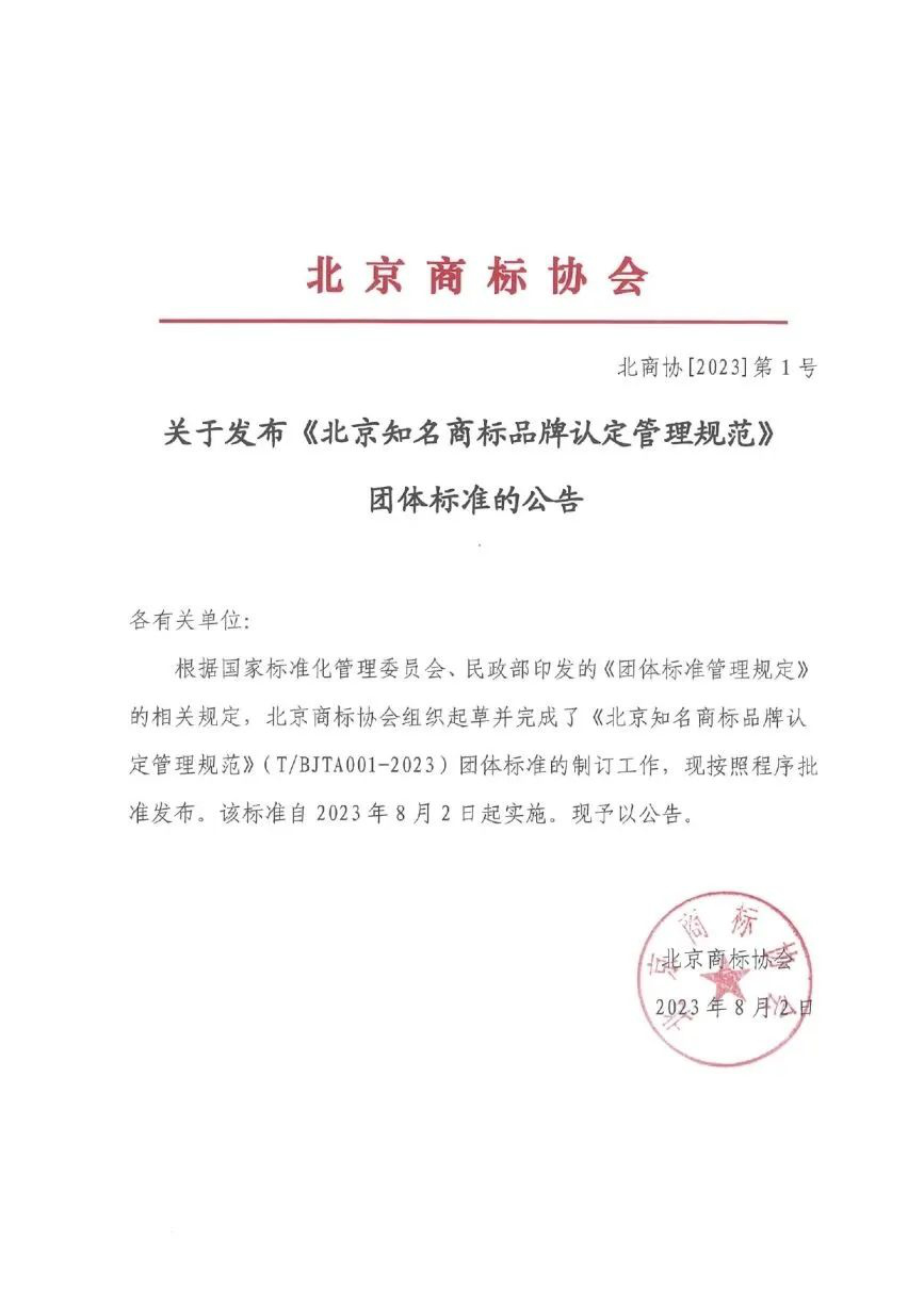為保護(hù)北京知名商標(biāo)品牌的權(quán)利人、使用者和消費(fèi)者的合法權(quán)益,提升商標(biāo)品牌價(jià)值,促進(jìn)企業(yè)提質(zhì)增效,同時(shí)為貫徹國(guó)家知識(shí)產(chǎn)權(quán)局《深入實(shí)施〈關(guān)于強(qiáng)化知識(shí)產(chǎn)權(quán)保護(hù)的意見(jiàn)〉推進(jìn)計(jì)劃》的政策精神,把北京打造成國(guó)內(nèi)及國(guó)際商標(biāo)品牌保護(hù)的新高地,將北京品牌推向全國(guó)及世界,塑造北京商標(biāo)品牌保護(hù)高水平、高質(zhì)量發(fā)展的新形象,北京商標(biāo)協(xié)會(huì)根據(jù)《中華人民共和國(guó)商標(biāo)法》《中華人民共和國(guó)標(biāo)準(zhǔn)化法》等有關(guān)法律法規(guī)的規(guī)定,經(jīng)反復(fù)討論分析,起草了《北京知名商標(biāo)品牌認(rèn)定管理規(guī)范》(討論草案),并多次組織相關(guān)專(zhuān)家學(xué)者就內(nèi)容進(jìn)行論證,廣泛征詢(xún)各個(gè)行業(yè)的意見(jiàn),積極采納相關(guān)修改建議,最終形成《北京知名商標(biāo)品牌認(rèn)定管理規(guī)范》(T/BJTA 001-2023),該標(biāo)準(zhǔn)自2023年8月2日實(shí)施。