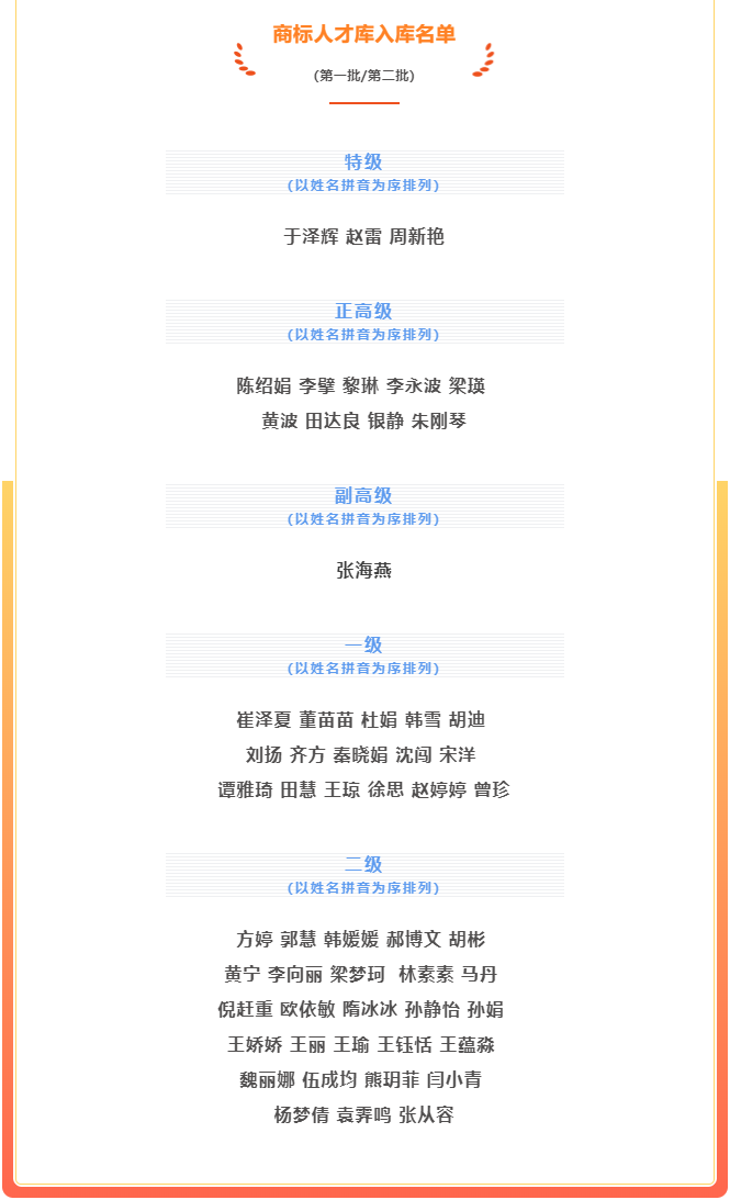 近日,中華商標(biāo)協(xié)會(huì)公布了2023年商標(biāo)人才庫(kù)入庫(kù)申報(bào)(第二批)合格人員名單,其中,集佳共有23位商標(biāo)代理人成功入選,包括3位特級(jí)、2位正高級(jí)、1位副高級(jí)、5位一級(jí)和12位二級(jí)人才。至此,集佳共有56位商標(biāo)代理人入選了2023年商標(biāo)人才庫(kù)。