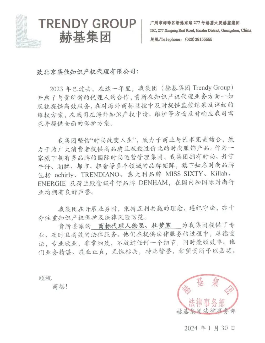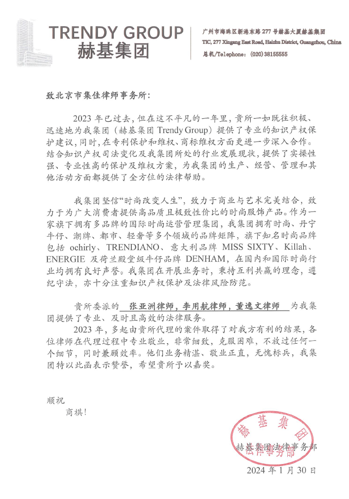 信中提到,2023年,集佳與赫基集團(tuán)在專利保護(hù)和維權(quán)、商標(biāo)維權(quán)方面更進(jìn)一步加強(qiáng)合作,集佳一如既往、迅速地為赫基集團(tuán)提供了專業(yè)的知識產(chǎn)權(quán)保護(hù)建議,集佳提供的實操性強(qiáng)、專業(yè)性高的保護(hù)及維權(quán)方案,為赫基集團(tuán)的生產(chǎn)、經(jīng)營、管理和其他活動方面都提供了全方位的法律幫助。赫基集團(tuán)法務(wù)部贊揚(yáng)集佳張亞洲律師、李用航律師、董逸文律師、徐思律師、商標(biāo)代理人杜夢寒等,在提供專業(yè)、及時且高效的法律服務(wù)的過程中,厚德重法,業(yè)務(wù)精湛,敬業(yè)正直,無愧標(biāo)兵。