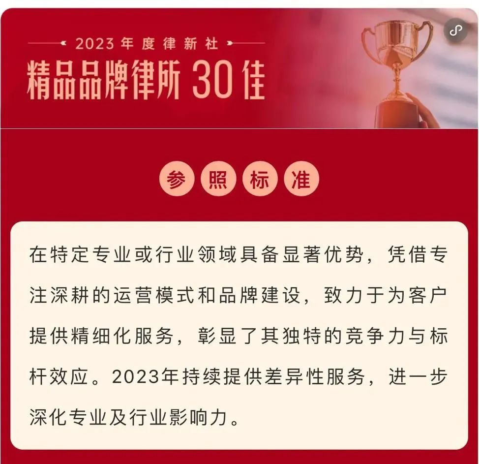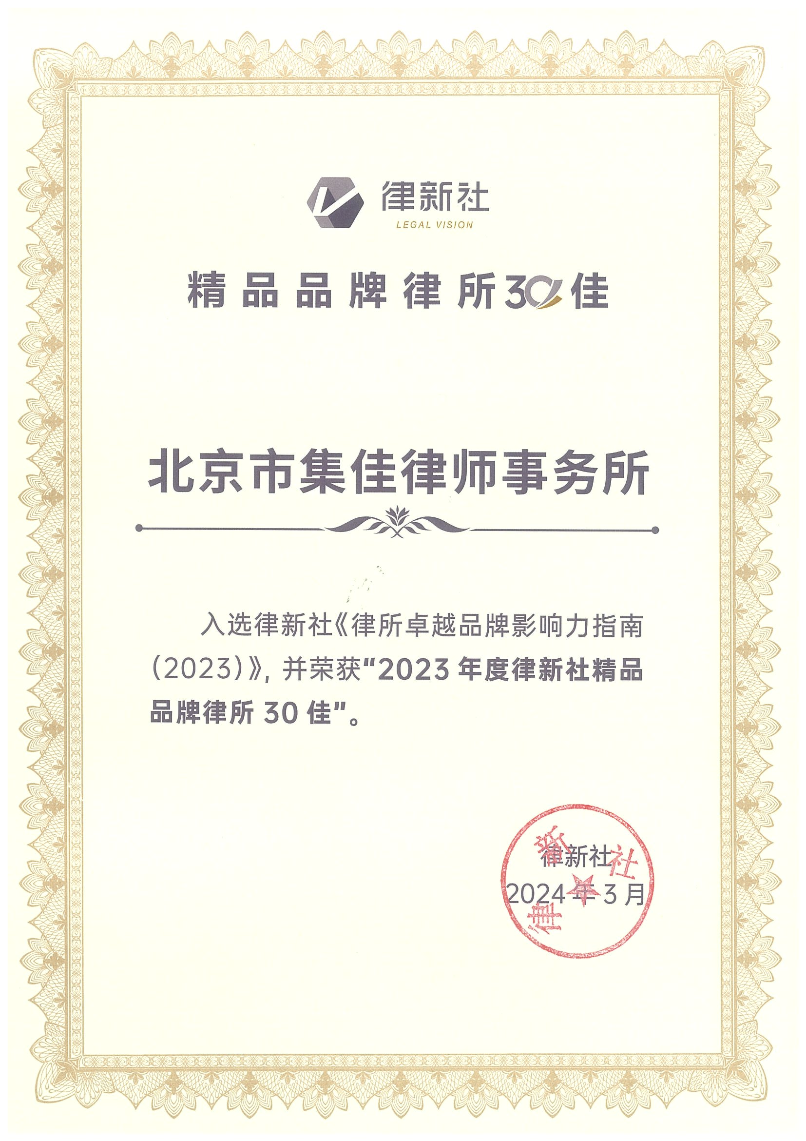 2024年3月2日,由中國法學(xué)交流基金會指導(dǎo)、律新社主辦的“致·追光者”第二屆法律服務(wù)業(yè)品牌發(fā)展論壇暨律新社2023年度品牌盛典隆重舉行,現(xiàn)場發(fā)布了備受關(guān)注的《律所卓越品牌影響力指南(2023)》,北京市集佳律師事務(wù)所憑借在知識產(chǎn)權(quán)領(lǐng)域的卓越實力和良好口碑,榮登“2023年度律新社精品品牌律所30佳”榜單。