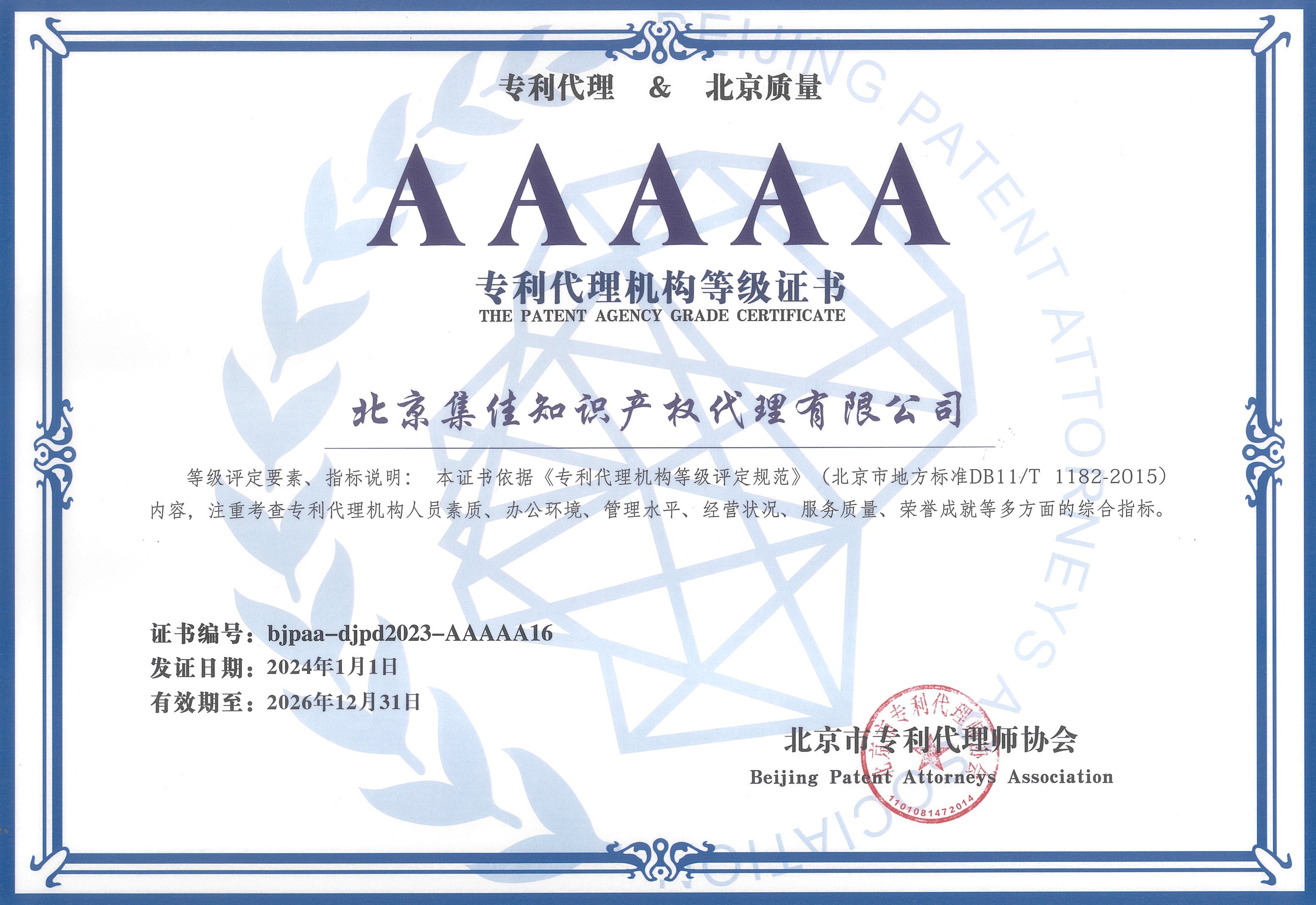 近日,北京市專利代理師協(xié)會(huì)發(fā)布2023年專利代理機(jī)構(gòu)等級(jí)評(píng)定結(jié)果,北京集佳知識(shí)產(chǎn)權(quán)代理有限公司憑借穩(wěn)健的綜合實(shí)力獲得各界肯定,再次獲評(píng)最高等級(jí)——AAAAA級(jí)專利代理機(jī)構(gòu)。